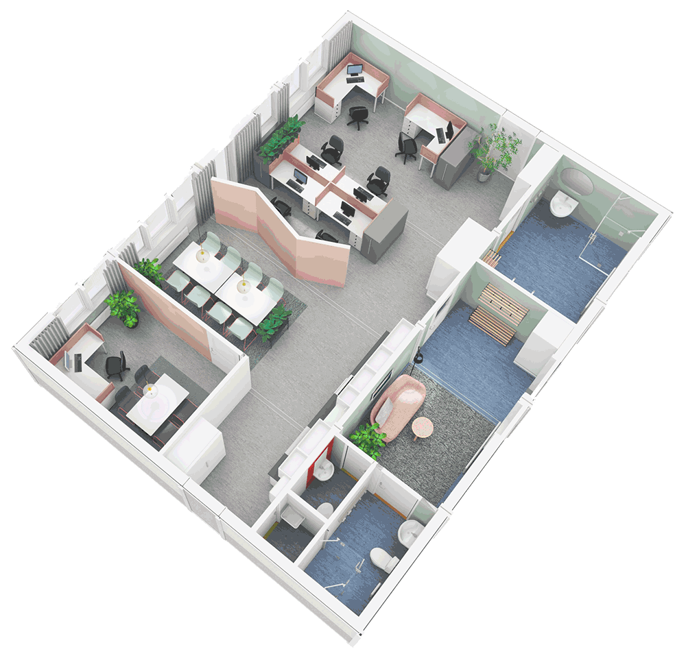 - Kan enkelt kompletteras med exempelvis konferensrum eller större pausrum