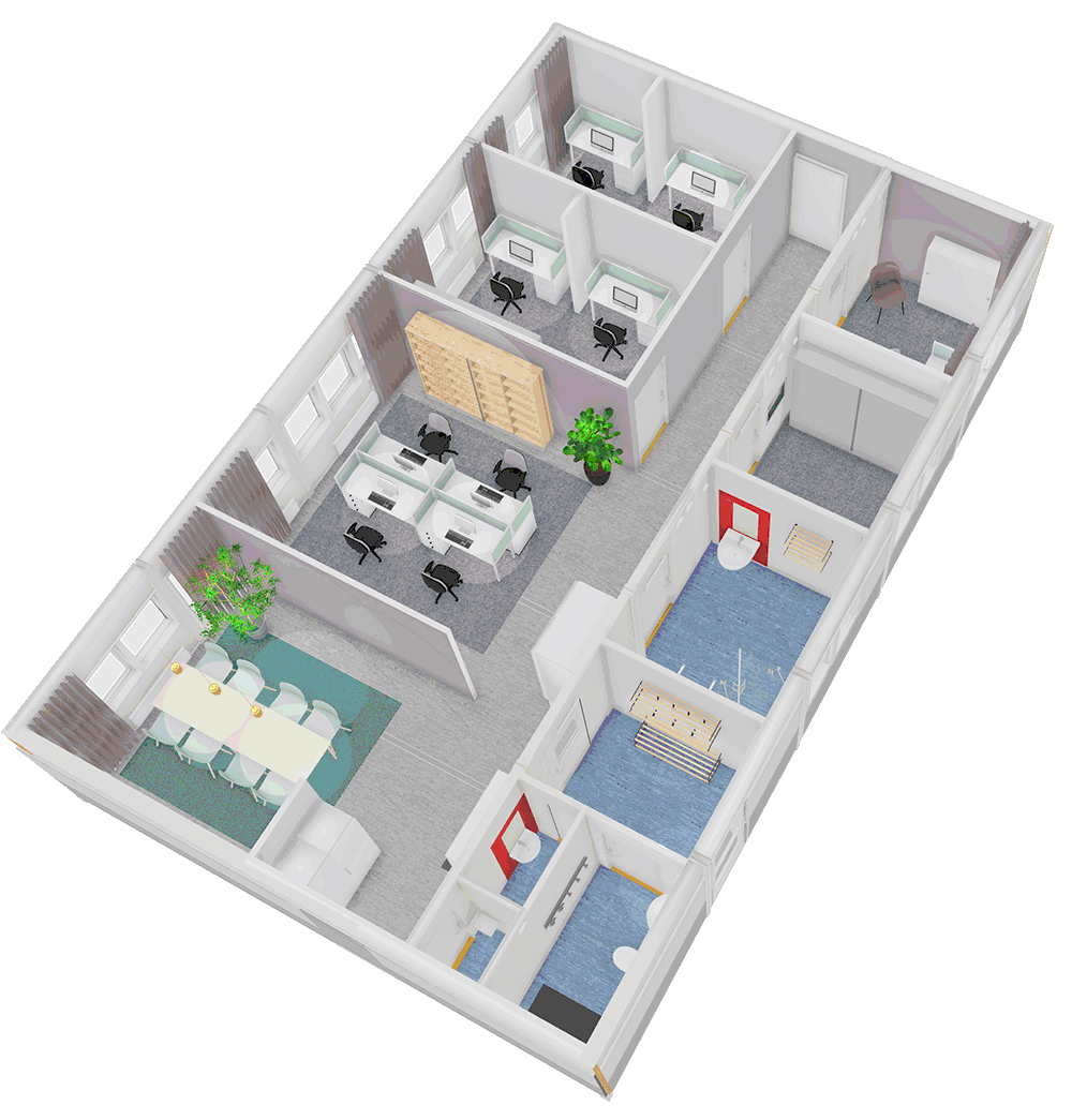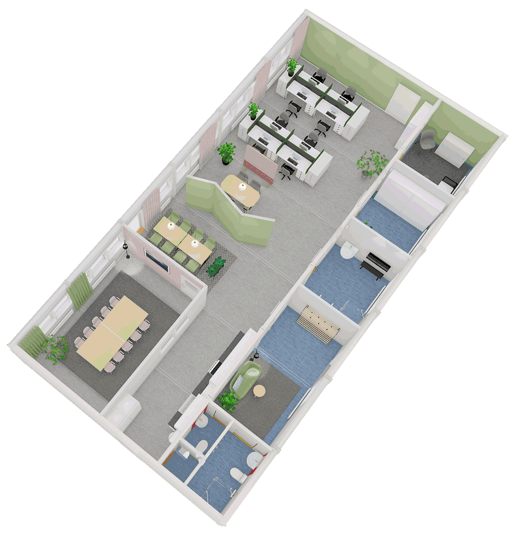 Till skillnad från de enkla byggbodar många är vana vid ger våra moduler bättre inomhusklimat och smartare planlösningar. De är utrustade från start med allt ni behöver, som pausrum, arbetsplatskontor, mötesrum, omklädning och duschar. De går att kombinera och sättas samman i ett eller två plan så att de matchar era behov.